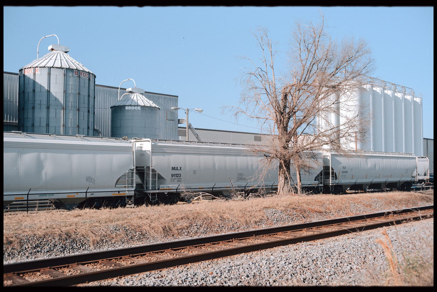 After the nursery, I found a large industrial facility and a train yard. A worker stood next to one of the train cars, so I went up and asked what they were loading. He said that he’s been working there for 30 years, and that they make plastic trash bags, and those tubes feeding into the train cars were pumping out plastic beads for production. I thought that was interesting. We chatted for a bit, I thanked him for his time, and moved on.